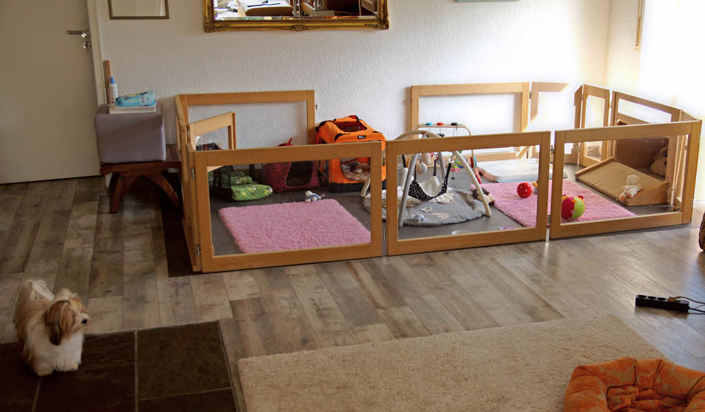 Bei uns sind die Welpen von Anfang an voll in die Familie integriert. Sowohl die Wurfbox, als auch das spätere Gehege befinden sich mitten in der Wohnung und nicht etwa in einem separaten Welpenzimmer.